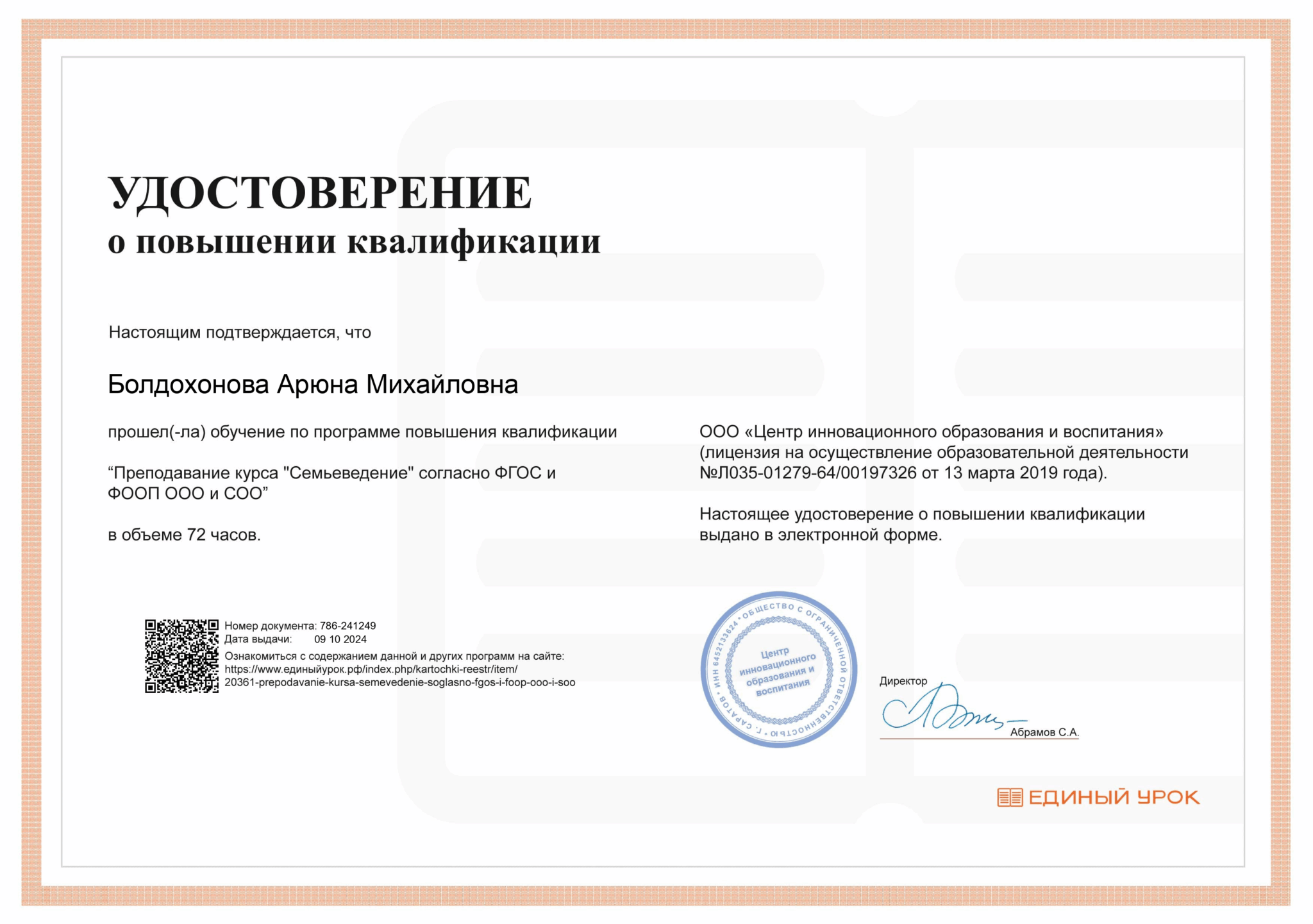 2024 г. — Центр инновационного образования и воспитания. «Преподавание курса «Семьеведение» согласно ФГОС и ФООП ООО и СОО».
