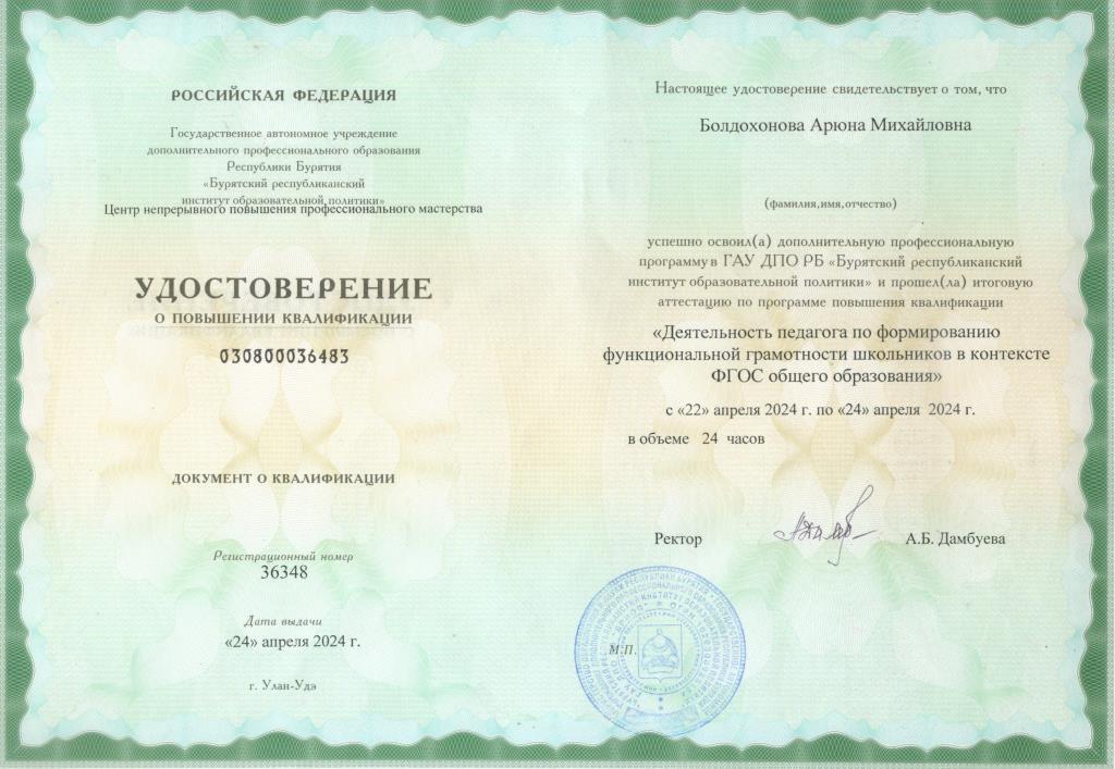 2024 г. — «Бурятский республиканский институт образовательной политики». «Деятельность педагога по формированию функциональной грамотности школьников в контексте ФГОС общего образования».