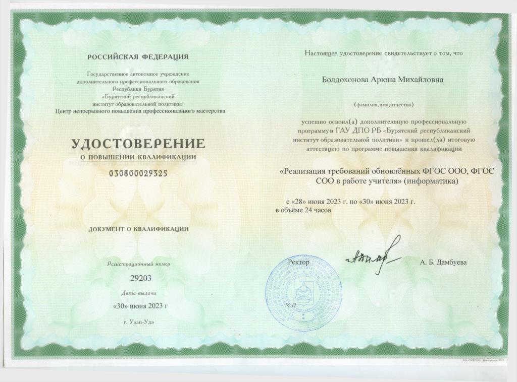 2015 г. — ГАУ ДПО РБ «Бурятский республиканский институт образовательной политики». Дополнительная профессиональная программа «Особенности изучения информатики в условиях введения ФГОС ОО»