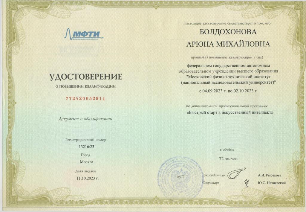 2023 г. — МФТИ. Дополнительная образовательная программа «Быстрый старт в искусственный интеллект».